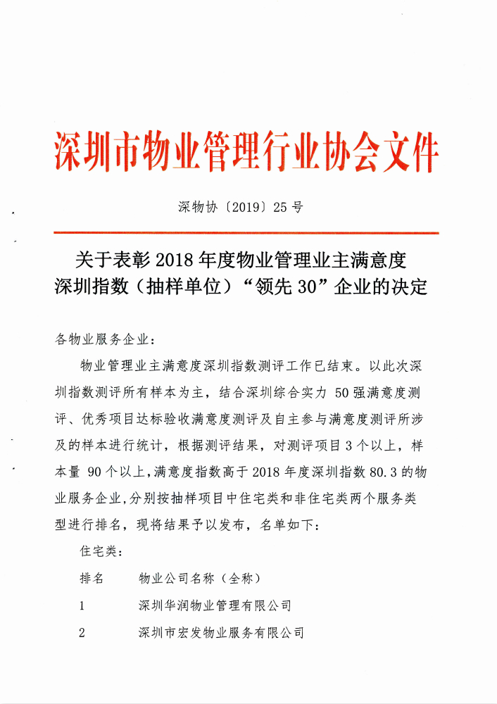 会议对获得2018年度物业管理业主满意度深圳指数(抽样单位)“领先30”的企业代表进行了表彰授牌!