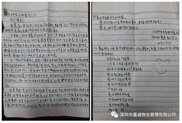 西乡中学高中部学生手写信表达对嘉诚人的感激之情;民治小学等三所学校非教团队因抗疫工作出色,获校方好评;在50号大院,嘉诚人密切配合市人居委环科院及桂园街道的抗疫工作,以铁的纪律和担当严防死守,确保大院一方平安,获得环科院表彰,为嘉诚人赢得荣誉。在住宅项目,融域名城、恒立心海湾等小区经受了一轮又一轮的疫情冲击,为小区铸起一道抗疫的铜墙铁壁,守卡口,测核酸,送快递,谋保障,功夫不负有心人,嘉诚人的点滴付出,换来小区平安无虞,业主点赞,政府褒奖,平凡的嘉诚人,仁心大爱,不负所托,用兢兢业业的工作书写嘉诚物业的不平凡之处。看医院项目,从北大深圳医院、宝安妇幼到龙华中心医院等,鏖战一线的嘉诚人铸牢健康防线,从院区保洁、医废运送着手,抓细节,瞄重点,坚持院感培训,长抓安全不懈,闭环运行,创平安医院,赢甲方夸赞。
