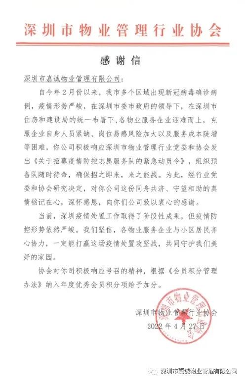 “一方有难,八方支援”!在福田区疫情告急,深圳市物业行业协会发出招募疫情防控志愿服务队的紧急动员令之际,嘉诚物业积极响应号召,第一时间组建党员志愿服务队,十名勇士,作为预备队,随时待命而行,招之即来,来之能战,后虽未能出征,但深圳物协对嘉诚物业这份同舟共济,守望相助的真情铭记在心,并发函致谢!
