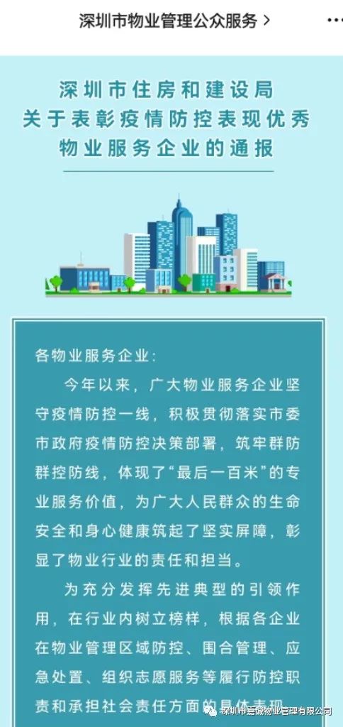在抗击疫情的日子里,嘉诚人不辱使命,夜以继日,顽强奋战,终有小成,因为抗疫工作出色,被深圳市住房和建设局表彰,获评“深圳市疫情防控表现优秀物业服务企业”称号,身为嘉诚人,与有荣焉!