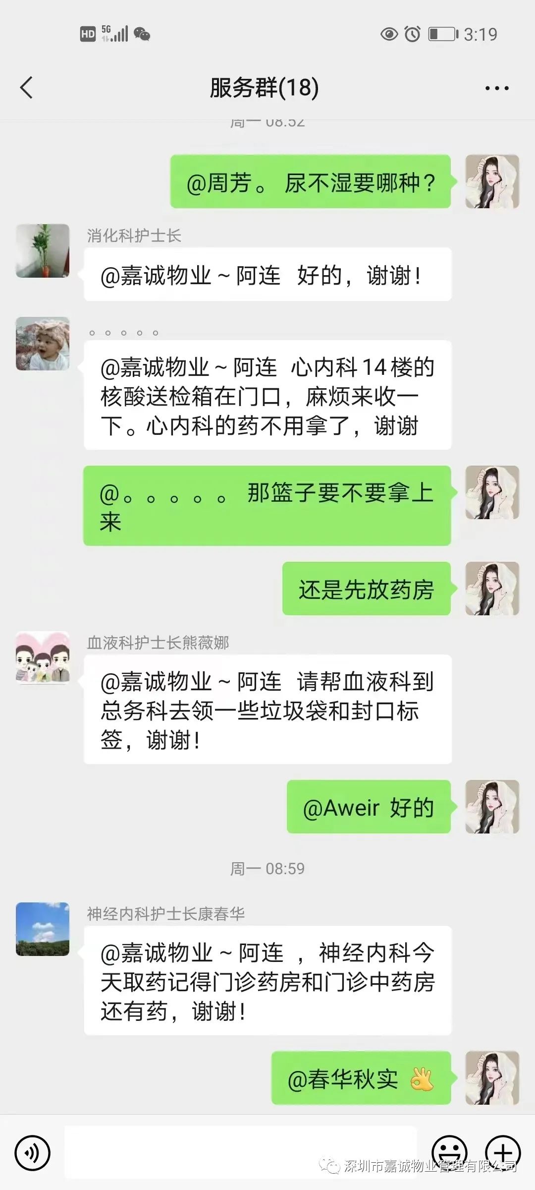 “阿莲,眼科14床需在门诊药房领药,核酸检测箱帮我们送检。”