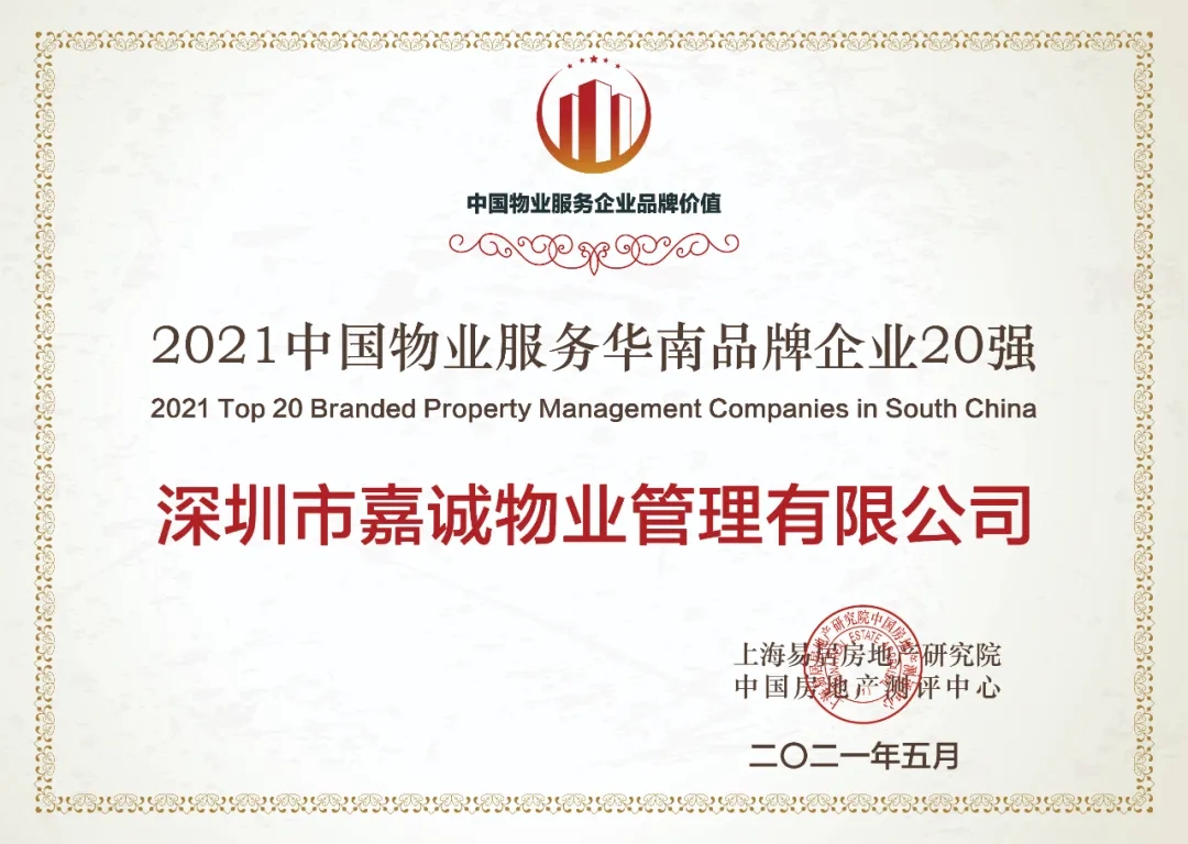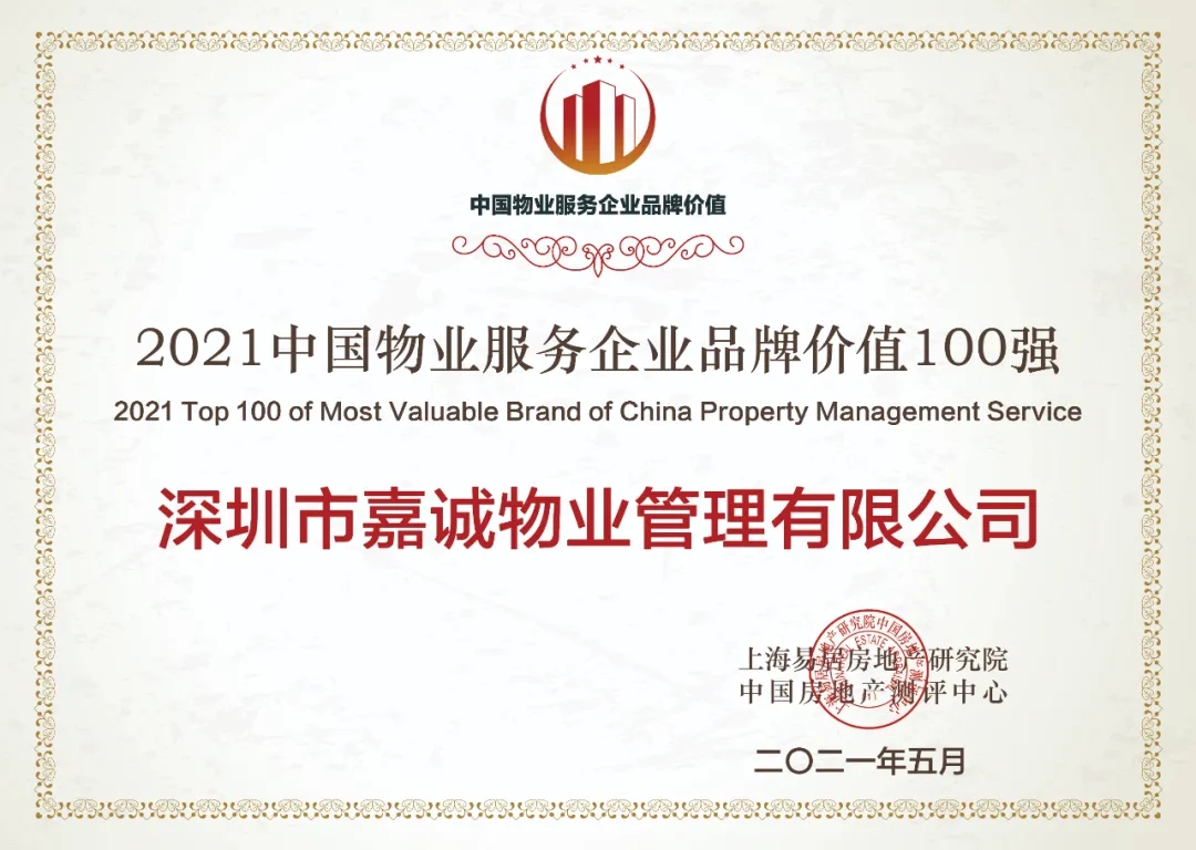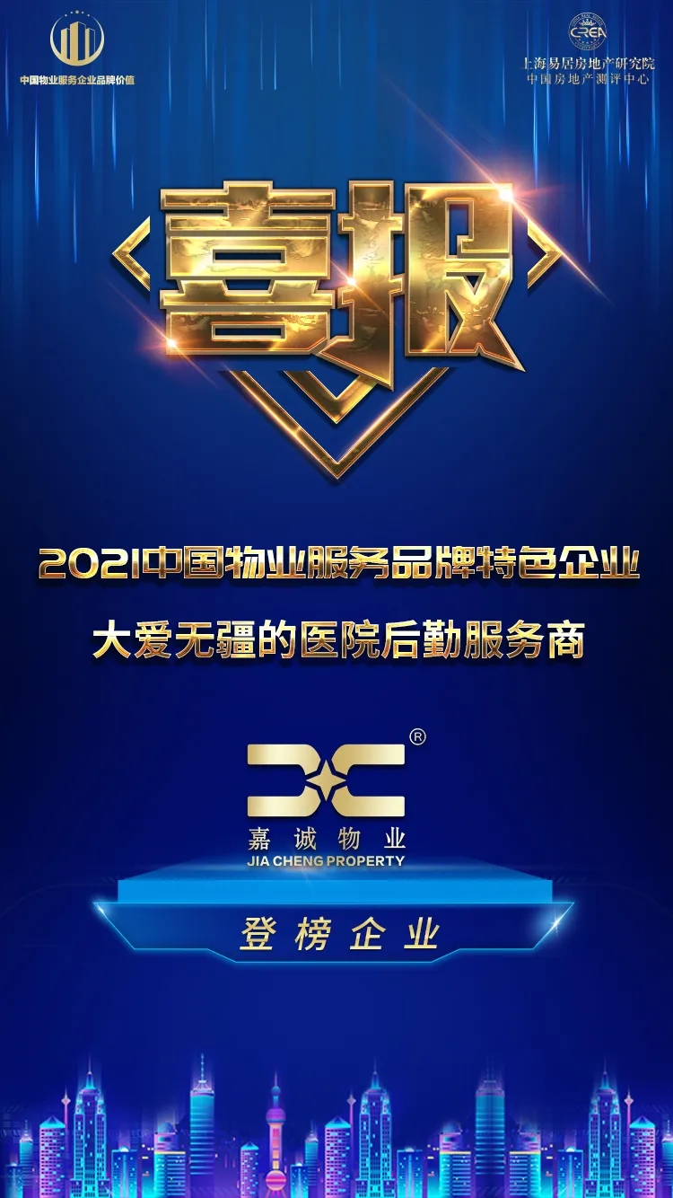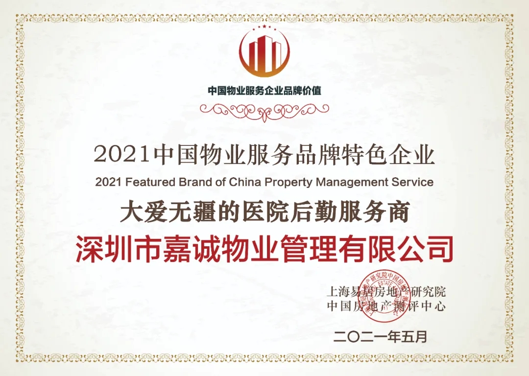 上海易居房地产研究院中国房地产测评中心同期揭晓2021中国物业服务企业品牌价值100强、物业服务品牌特色企业以及各区域物业服务品牌企业榜单。嘉诚物业荣获“2021中国物业服务企业品牌价值100强”、“2021年中国物业服务华南品牌企业20强”及“2021中国物业服务品牌特色企业-大爱无疆的医院后勤服务商”。
